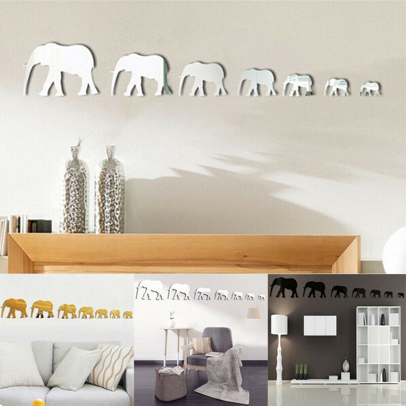 7 Elephants Mirror Wall Stickers Color Silver New Home 3d