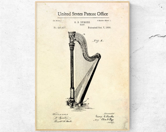 Harp Patent Print Vintage Blueprint Poster Music Room Decor Etsy