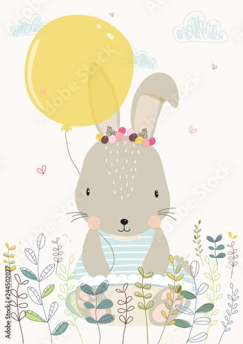 Vector Illustration Of Cute Happy Rabbit Wears Blue Dress With