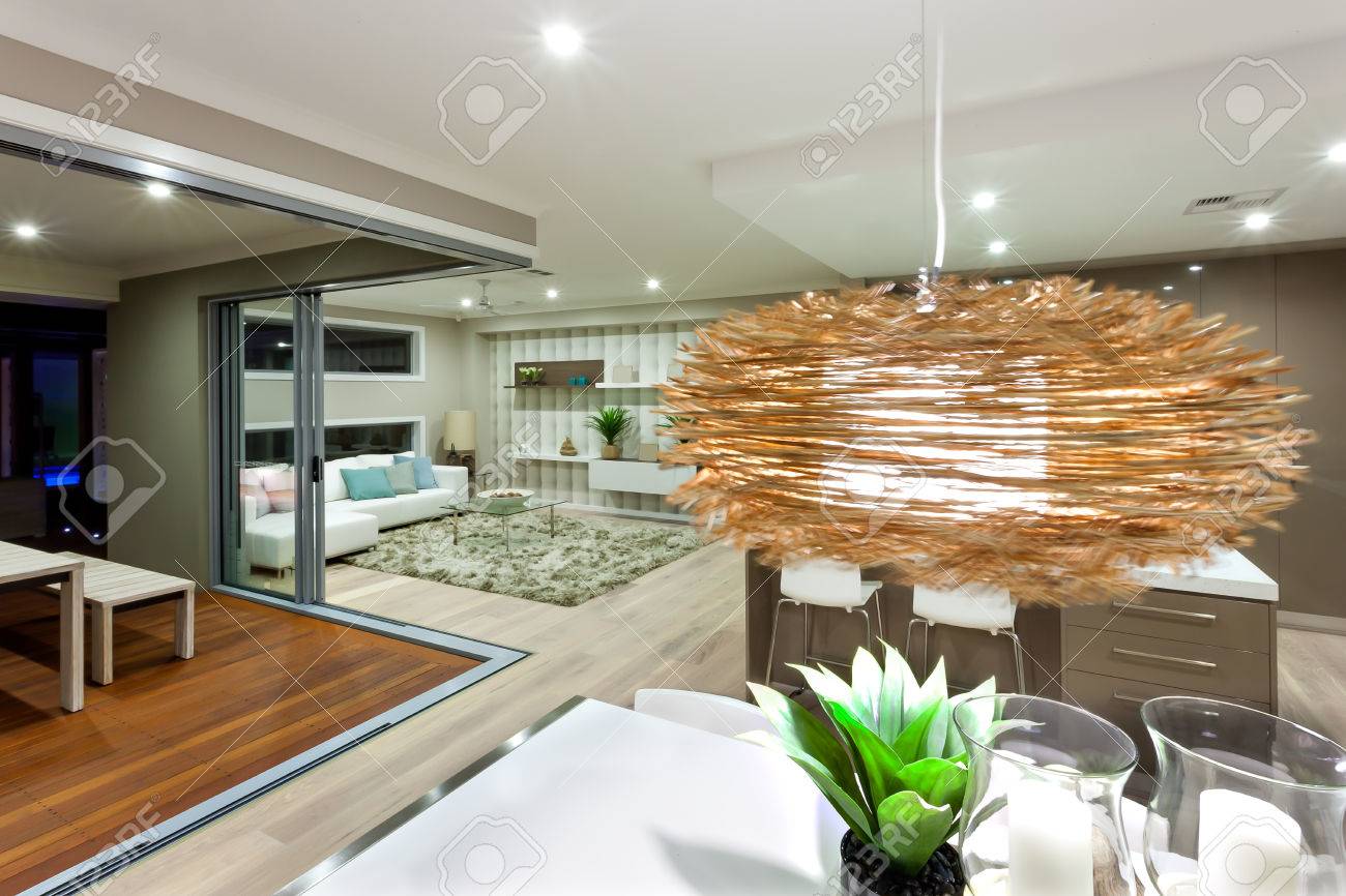 Luxury House Interior With Hanging Bamboo Or Rattan Lamp