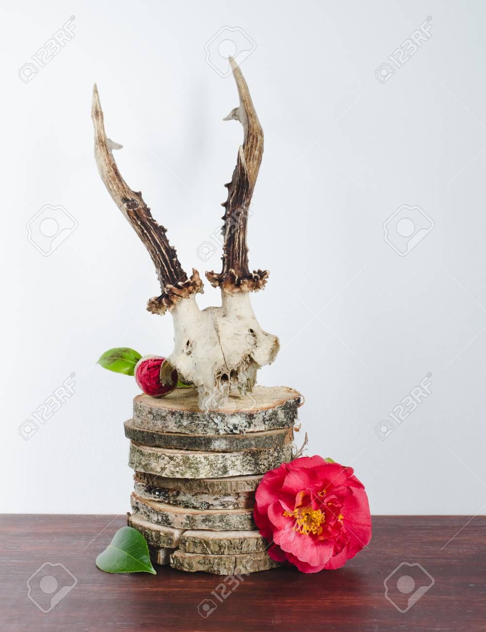 Deer Skull For Decoration With Camellias On Birch Trunk And Wooden
