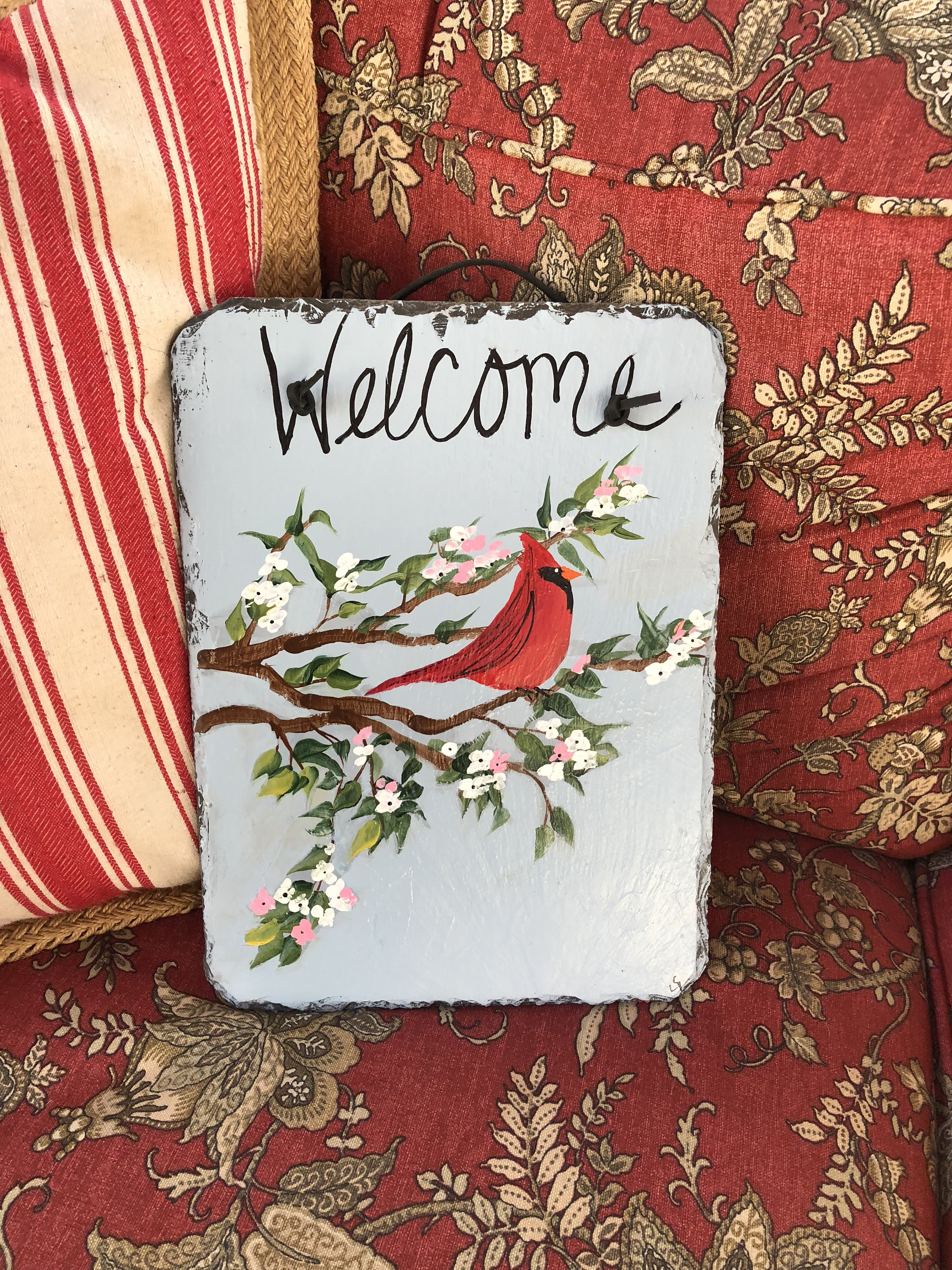 Welcome Sign Spring Door Decor Painted Slate Red Cardinal