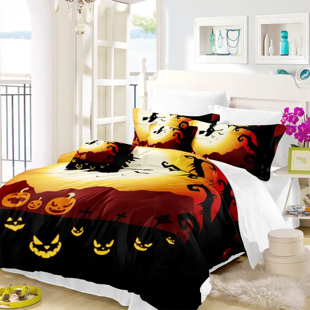 Halloween Cartoon Pumpkin Bedding Set Witch Print Duvet Cover Set