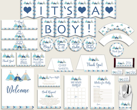 Blue Beige Baby Shower Decorations Boy Kit Tribal Teepee Baby